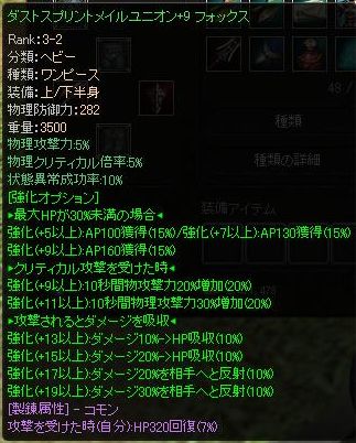 ユニ イースオンライン 2010.04.21 前回作ったユニを着て記念写真を撮ってみました。 キーモが着ると、正直変ですねー・・・( ̄Д ̄;) かっこよさは31のほうが上。。 いまのところ、31のほうがまだ防御力高いのであくまでサブ用かな。 ちなみに強化製作上級っていったいいくつまでが現実的なんだろう・・・。 たぶん10以上を作るのは容易じゃないはずだからな。 13でも鍛えられるならおそらく+9とかでたらそれで十分なんでしょうが。