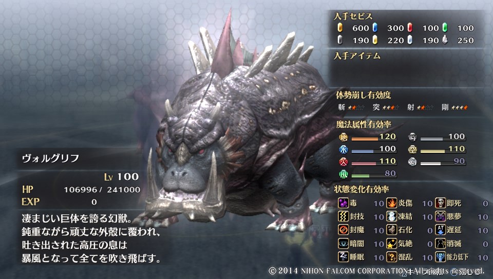 ヴォルクリフを倒すメモ 閃の軌跡1、2、3、4 2014.09.29 最初に登場する(?)強力な幻獣。 メモ。 シナリオ進めているだけだとレベルが70台なので 倒すのは少し辛い。 戦うときのメモ。 ・エマ必須。魔法反射。技や大技の魔法を反射可。敵は魔法詠唱時間はゼロ。即時発動してくるので駆動解除では対応できない。 ・CP回復節約、補給方法用意したほうがよいがリンクで稼ぐのも手か。 ・PTメンバーは固める。離れない。 ・SPDアップや攻撃力アップは切らさない。 ・追撃や総攻撃重視。エマやガイウスの体勢崩しの効果もあったほうがいい。