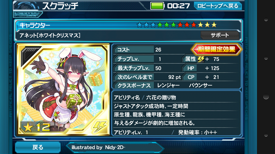 esスクラッチ「PSO2es St.Xmas★2016」の結果 PSO2・PSO2es 2016.12.24 引いてみた結果。 SSはACスクラッチ。メダルも引いたんだけど、刀のPAだけだった&SS取り忘れた。 48時間限定の割にはクリスマスアネット以外は微妙かな。 もとより☆12チップなんて、そうそう出ませんからね。 フェザーのほうも性能的にアクティブはなぁ、と。 絵はいいのにね。