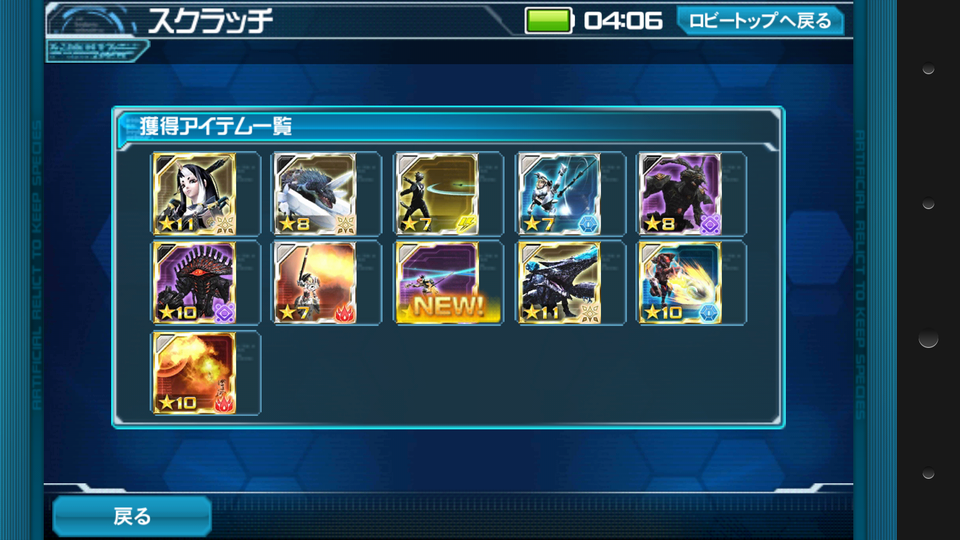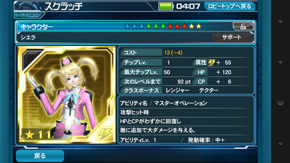 pso2es esスクラッチ「3周年バースデー・スペシャル」 結果 PSO2・PSO2es 2017.05.13 今日から2日間限定のスクラッチの結果。 初回1000円なので、メダル1回(11連)とAC1回(11連)やりました。 シエラは比較的最近追加されたチップだけど、 性能的には大分昔のものだよなぁ。リサとかが普通に現役の人なら十分通用するんだろうけど・・・。