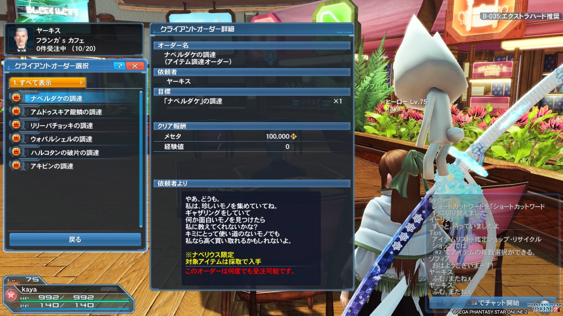 pso2 なんとなく捨てるには勿体ない金策 PSO2・PSO2es 2017.09.16 フランカのカフェにいるフリー○の声の人^^; ギャザリングして拾ったものを渡すだけで10万メセタ×6をくれる人。 1週間に1回しかできないのがネックだが、使い道のない(実はあるのか)ものを高額で売りさばけるのはいいですね。