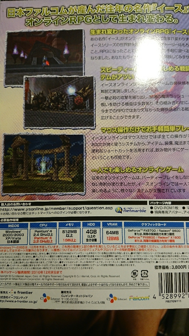 イースオンライン 古代シーマの鼓動 追加パッケージ イースオンライン 2018.01.14 今年引っ越す予定なのですが、ごみ掃除をしていたら妙なものがw たしかコスをもらったり、カンストレベル85にするためのパッケージですね。 ちなみにこれ、DVDがついてて未開封(!)だったのでなんだろう、と思って読み込んでみたら、単なるインストーラーでした。。 うん、さようならw