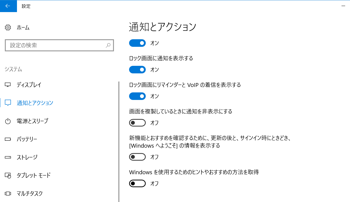 ③ 通知とアクションにある、「Windowsを使用するためのヒントやおすすめの方法を取得」をオフに変更。