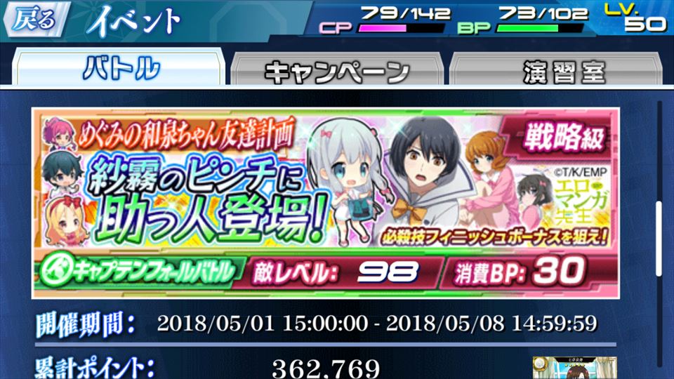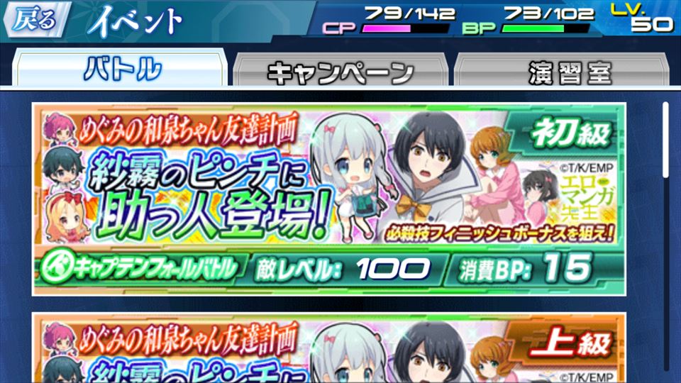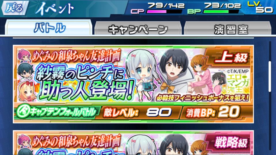 ちなみにカードは、泉美は「和泉紗霧2」(通常・必殺ともに全体攻撃、必殺は12秒間ダメージ増加、さらに深雪がいるとダメージ5倍)、深雪は「和泉紗霧4」(通常は単体・必殺は全体、必殺は敵が3体以下だとダメージ増加)なので、コンボとしては相性がかなり良さげ。