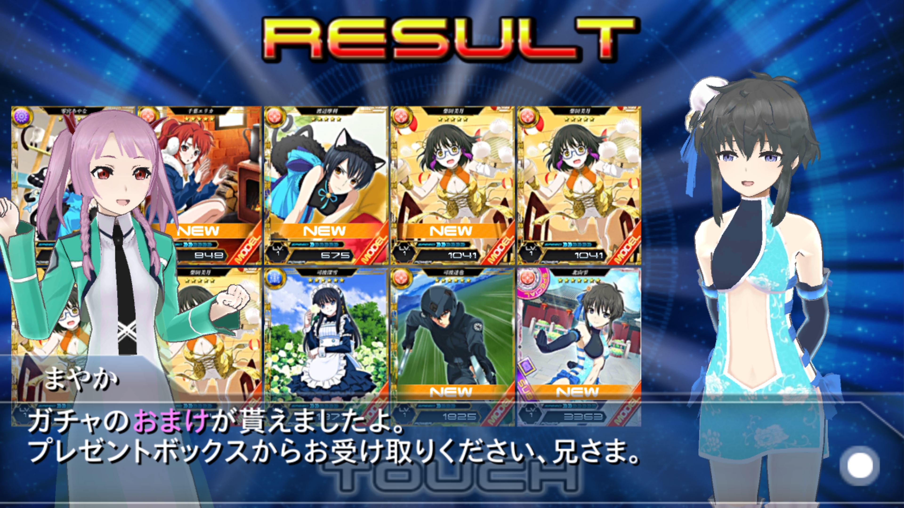 魔法科高校ロスト・ゼロ 2018チャイナガチャ 魔法科高校の劣等生 LZ 2018.07.09 ガチャネタです。 某ゲームと違ってガチャを回すためのアイテムの溜まりがだいぶ悪いので、なかなか回せませんが、とりあえず回してみた。 2018チャイナガチャの第一弾のやつなので、常設星8と星7までの目玉カードのみ。 もとより8は期待してないので、雫が出ただけでもましか。 たしか目玉といえど、7は1.5%らしいですからね。 10連しかしてないから、単純計算でも15%。 出るだけましだ、これはw てか、美月ですぎですね。4枚か。