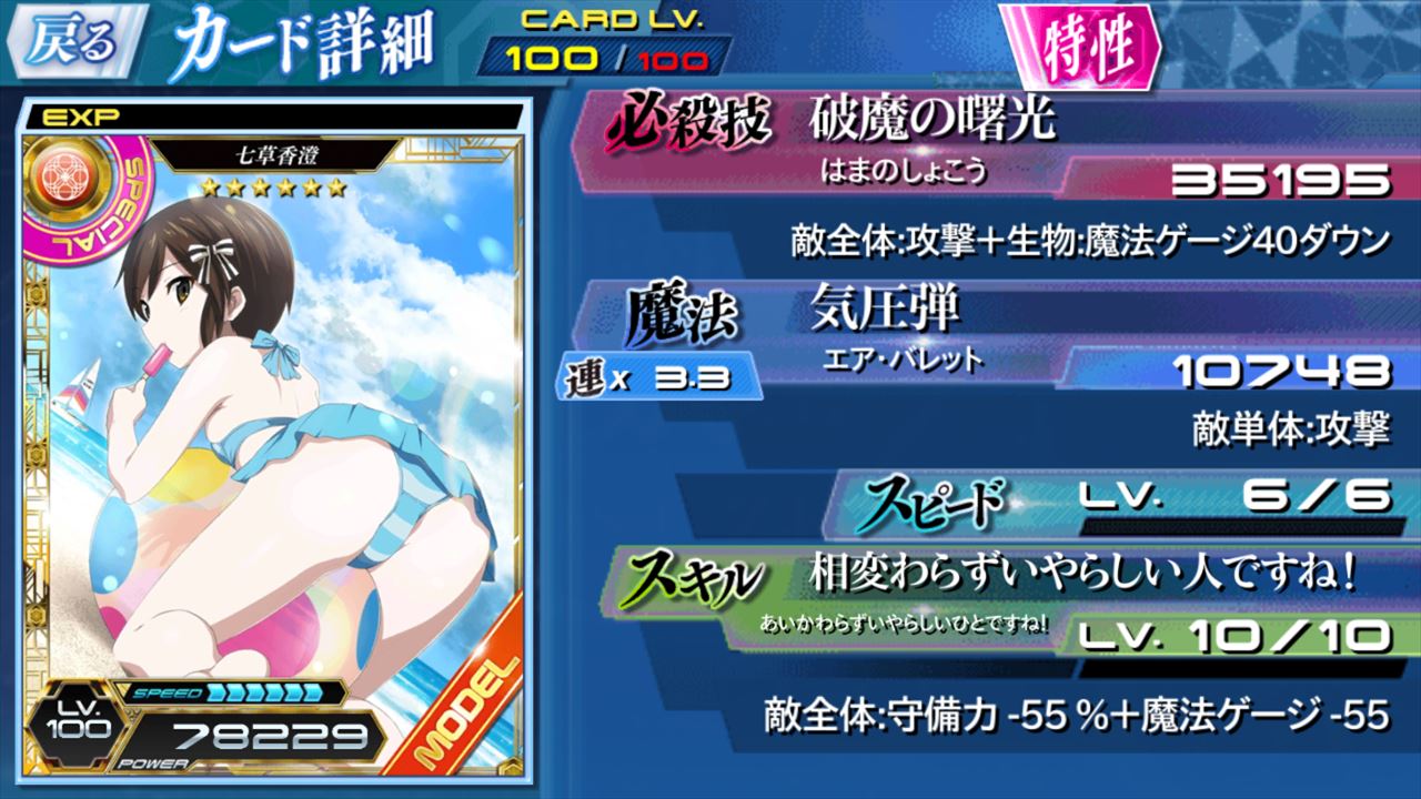 魔法科高校Lost Zero 連携倍率とか 魔法科高校の劣等生 LZ 2018.10.27 個別の敵とは別にボスのHPゲージを減らせってイベントで最近ようやく連携倍率上昇キャラを使おうと思ったのですが、倍率が高ければいいってわけじゃないんですね。 連携倍率が高い=攻撃力自体は低い、よって素のダメージが低くなるのでいくら倍率が上がっても大したダメージにならない、という図式が。 相手次第で攻撃力と倍率のバランスを変える必要があるのか。 結構手間だった。 いや、星8カードみたいな最上級カードがあれば話は別なんでしょうが。