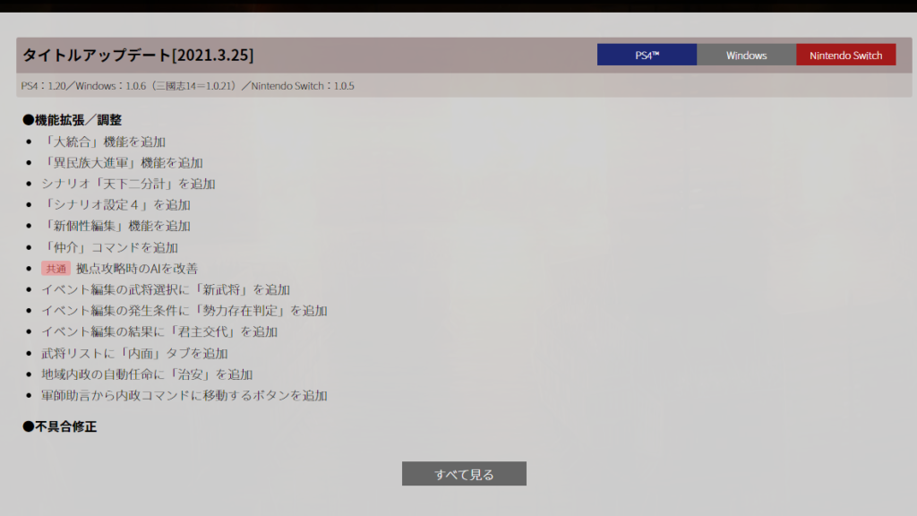 三国志14 アップデート3/25 三国志(戦略シミュレーション) 2021.03.27 https://www.gamecity.ne.jp/sangokushi14/portal/info-update.html色々追加されたようだけど、大進軍ってなんだろう・・・。機能というからには、大統合同様のイベントなんだろうけど。終盤になると四方から押し寄せてくるとかかな。