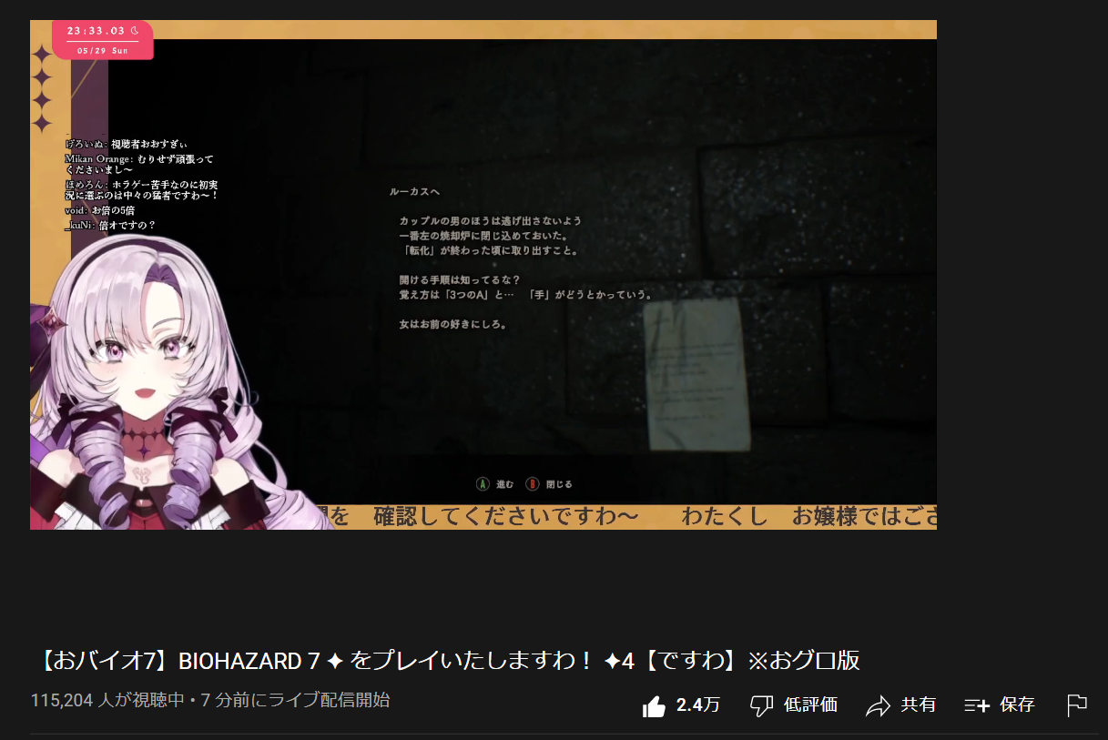 えにからの新人さん Vtuber 2022.05.29 壱百満天原サロメさんのことですが、久々にかなり面白い人見つけたなぁ。基本、Vは歌がうまいか、極々一部の人しか継続的に見ないんだけど・・・普通のゲーム実況でも見たくなるタイプですね。ひたすら話し続ける感じ、話し方、声、振る舞い、どれもハマる。ただのおバイオなのに11万も同接あるってことは似たようなこと感じる人が多いってことなのかなぁ。