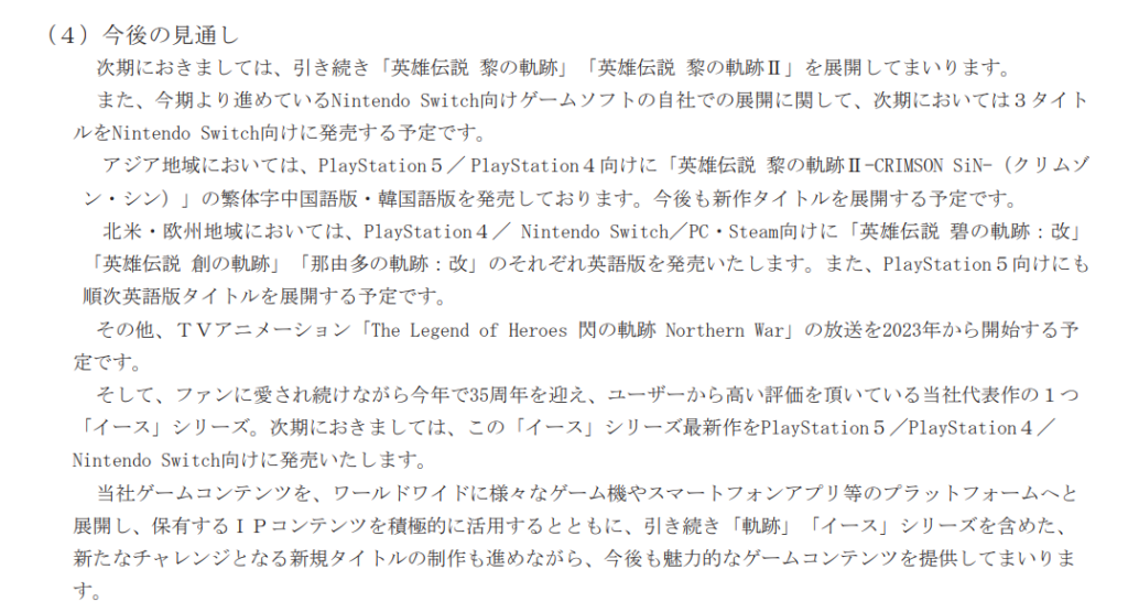 2023年にイース最新作?(イース10?) ファルコム全般 2022.11.12 今更ですが、2022年9月期 決算短信の資料にイース最新作の記載がありますね。ザナドゥとか、そちらもそろそろ出してほしい感あるけど、楽しみですね。 https://www.falcom.co.jp/page/wp-content/uploads/2022/11/2022_4Q.pdf