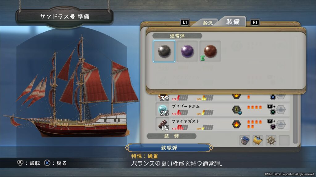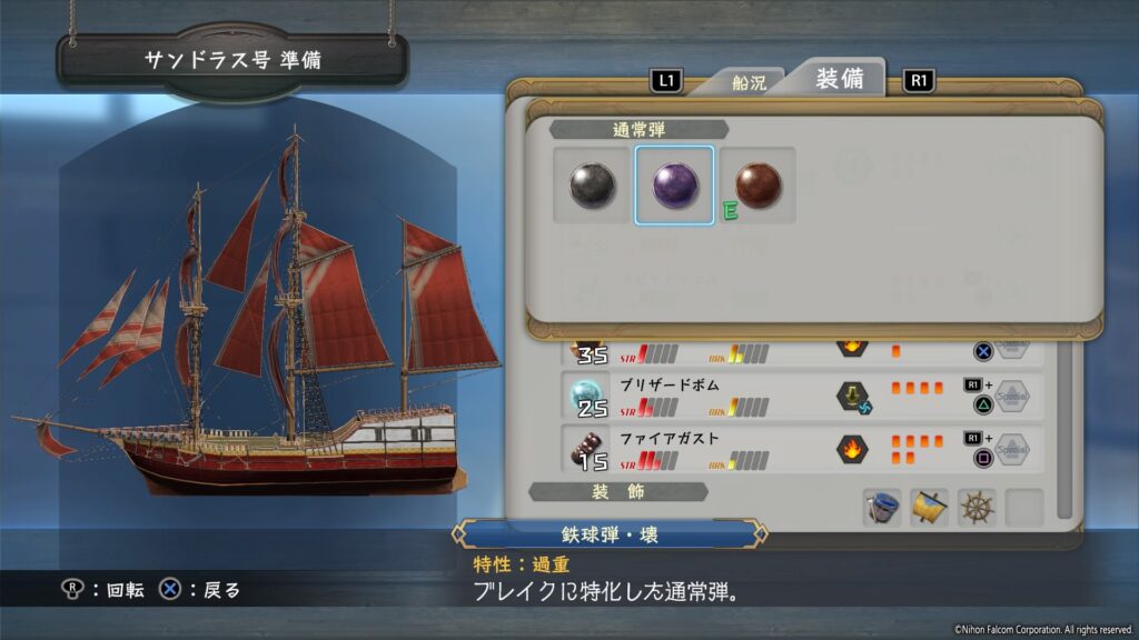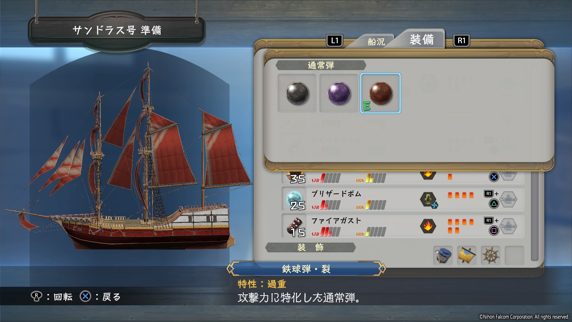 イース10 サンドラス号の通常弾 イース10(イースⅩ) 2023.10.08 通常弾の種類が途中から増える。最初はブレイク重視もいいかと思ったけど、結局のところ、攻撃力重視の方が早いように思う。ブレイクすると船足がかなり遅くなるけど、ブレイクさせるにはそれでもそれなりに時間がかかるし、なにより攻撃力がかなり低い。攻撃重視の一発のダメージがブレイクの数倍はありますね。あとは爽快感もあるかも。