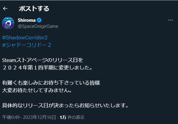 ShadowCorridor2 発売日は2024年第1四半期に延期 影廊 ShadowCorridor 2023.12.16 延期が発表されました。なお、この場合の第1四半期は1~3月(steamの1Q時期に関する参考:Steam Deck:第1四半期(Q1)の出荷について)のことです。 #ShadowCorridor2#シャドーコリドー2Steamストアページのリリース日を2024年第1四半期に変更しました。有難くも楽しみにお待ち下さっている皆様大変お待たせしてすみません。具体的なリリース日が決まったらお知らせいたします。— Shiroma (@SpaceOnigirGame) December 16, 2023 Xにログインしていない人向け(ログインしていても埋め込みが上手く表示されないこともあるため)。 ※クリックで拡大