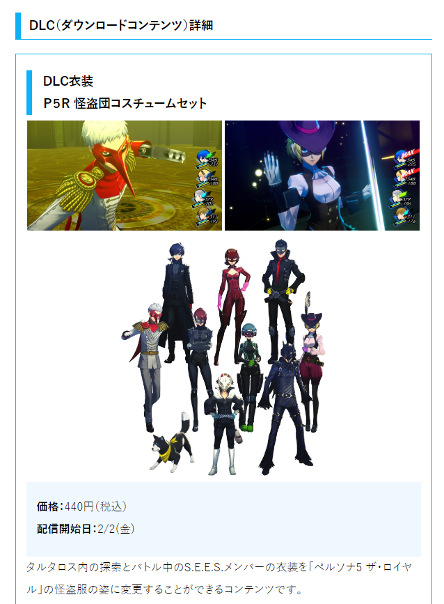 P3R DLCコンテンツ情報 ペルソナ3 2024.01.20 https://p-ch.jp/news/13087/ ペルソナ3でペルソナ4や5の服を選べるのはリメイクならではですね。他にもP4等もありますが、P5Rの服装がかなり気になっていて、こうしてみるとP5Rの服とP3Rのキャラ対応図、しっくりと来てるな、と。ゆかり、てれってー、美鶴しかり、真田と荒垣も。