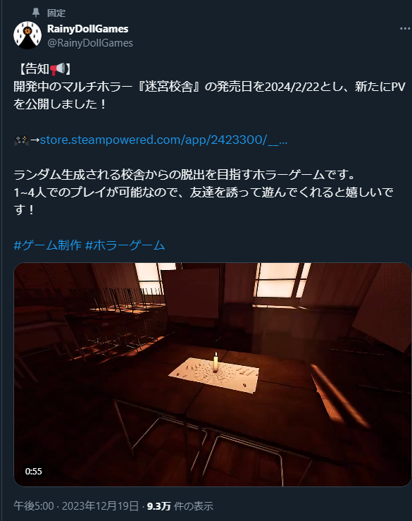 新作ホラーゲーム 迷宮校舎 | School Labyrinth 2024年2月22日発売予定 ホラーゲーム 2024.02.20 Unknown Pyramid(アンノウン・ピラミッド)の作者の新作のようです。12月発表なのに気付きませんでしたね…。ランダム生成、脱出ゲーなのにマルチホラー?! ◆Steamページ https://store.steampowered.com/app/2423300/__School_Labyrinth/ ◆X告知(画像、生ポスト) 【告知📢】開発中のマルチホラー『迷宮校舎』の発売日を2024/2/22とし、新たにPVを公開しました!🎮→https://t.co/FxDpxB2OF6ランダム生成される校舎からの脱出を目指すホラーゲームです。1~4人でのプレイが可能なので、友達を誘って遊んでくれると嬉しいです!#ゲーム制作 #ホラーゲーム pic.twitter.com/cuxlu3BIBp— レイニードール☔🎮RainyDollGames (@RainyDollGames) December 19, 2023 ◆PV PVもありましたので以下からご覧ください。他人が先にロッカーに入った…とか、とうとう見れたなwBGM等の雰囲気もどこか前作を思わせるところがあって良いですね。