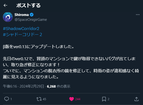ShadowCorridor2 β版v0.13リリース 2/29 ホラーゲーム 2024.02.29 どうやら0.12で序盤、進行不能になる不具合が出たようです。さすがにこれは誰も気付かなさそうですね。。綺麗に見えるようになるのもありがたい。 #ShadowCorridor2#シャドーコリドー2β版をver0.13にアップデートしました。先日のver0.12で、冒頭のマンションで鍵が取得できないバグが出てしまい、取り急ぎ修正になります!ついでに、マンションの脱衣所の鏡を修正して、時雨の姿が違和感なく綺麗に見えるようになりました。— Shiroma (@SpaceOnigirGame) February 29, 2024 画像版は以下。