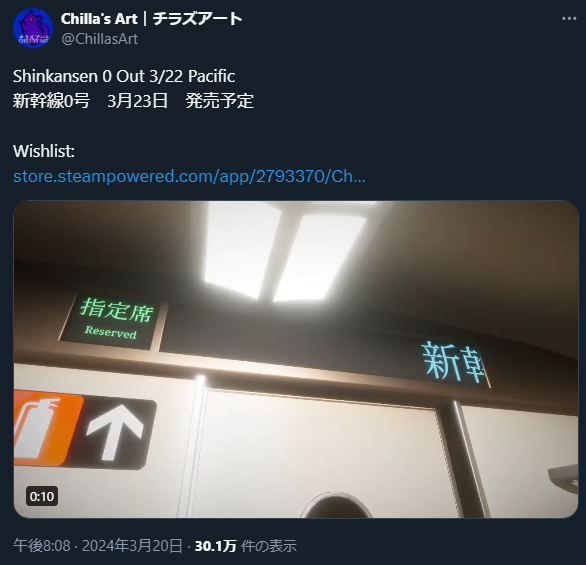 Chilla’s Art チラズアート 新幹線0号 24/3/20発売 Chilla's Art(チラズアート) 2024.03.20 いよいよ次作が発売されるようです。以前も色々書きましたが、間違いを探すのはどうやるのかな。一番ありそうなのは車両から車両へ移動していく繰り返しタイプだと思うけど、「I’m on Observation Duty」ライクとも書いてあるのが気になる。カメラを使った確認とかもあるのかな。SteamとXのリンクは以下。 https://store.steampowered.com/app/2793370/Chillas_Art_Shinkansen_0___0/ Shinkansen 0 Out 3/22 Pacific新幹線0号 3月23日 発売予定Wishlist:https://t.co/Yy0Cw2oBnl pic.twitter.com/E4uHkwmtij— Chilla's Art|チラズアート (@ChillasArt) March 20, 2024 画像版は以下