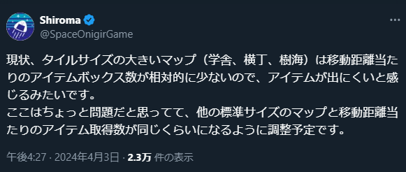 ShadowCorridor2 アイテムが少ないと感じるステージがあるのは気のせいらしい ホラーゲーム 2024.04.03 シャドコリ2ばかりに時間を費やしてあまり投稿出来ていませんでしたが、やはり凄い面白いですね。で、作者の城間さんが、私が思っていたことをポストされていましたが、どうやら少なくしているとかではないらしい。これはしっかり全ての場所を探せば少ない、ということはないはずということなのかな。横丁とか樹海は部屋以外、基本的に箪笥が無いから自ずとアイテム数は減ると思ったんだけど、さすがにその分は少なくなるが、それ以外の場所では同じくらいあるはずだよ・・・ということなのかなぁ。 現状、タイルサイズの大きいマップ(学舎、横丁、樹海)は移動距離当たりのアイテムボックス数が相対的に少ないので、アイテムが出にくいと感じるみたいです。ここはちょっと問題だと思ってて、他の標準サイズのマップと移動距離当たりのアイテム取得数が同じくらいになるように調整予定です。— Shiroma (@SpaceOnigirGame) April 3, 2024 画像版は以下。