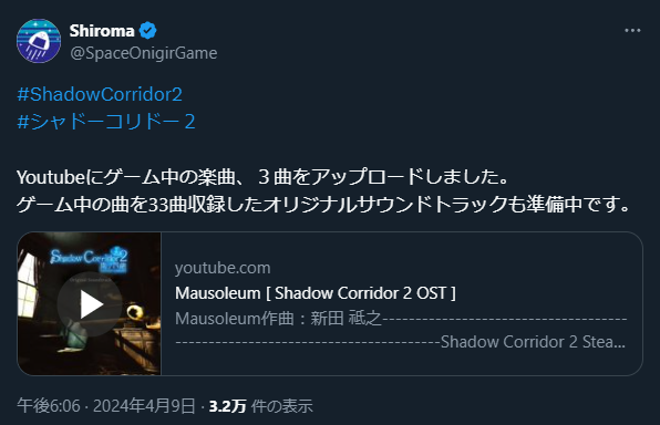 ShadowCorridor2 サントラサンプル 影廊 ShadowCorridor 2024.04.09 そろそろサントラが出そうです。好みの曲が多かったので楽しみです。クラウドファンディングでサントラ付きにした場合はダウンロードに関する案内が来るようなので連絡が待ち遠しい。 #ShadowCorridor2#シャドーコリドー2Youtubeにゲーム中の楽曲、3曲をアップロードしました。ゲーム中の曲を33曲収録したオリジナルサウンドトラックも準備中です。https://t.co/NK9yTK2F0g— Shiroma (@SpaceOnigirGame) April 9, 2024 画像版は以下 サンプルのリンクです。3曲公開されています。