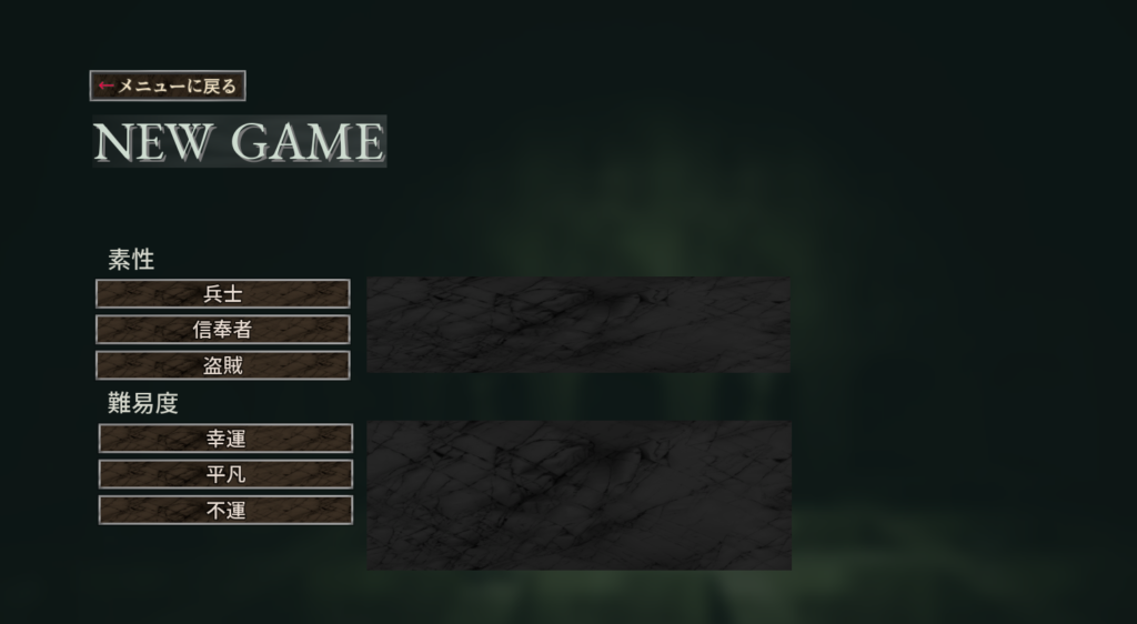 ゲーム開始時に難易度を選べるんだけど、能力値が異なる職を選べた。能力値以外でどんな違いがあるかは不明。