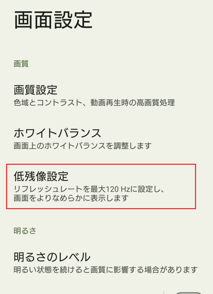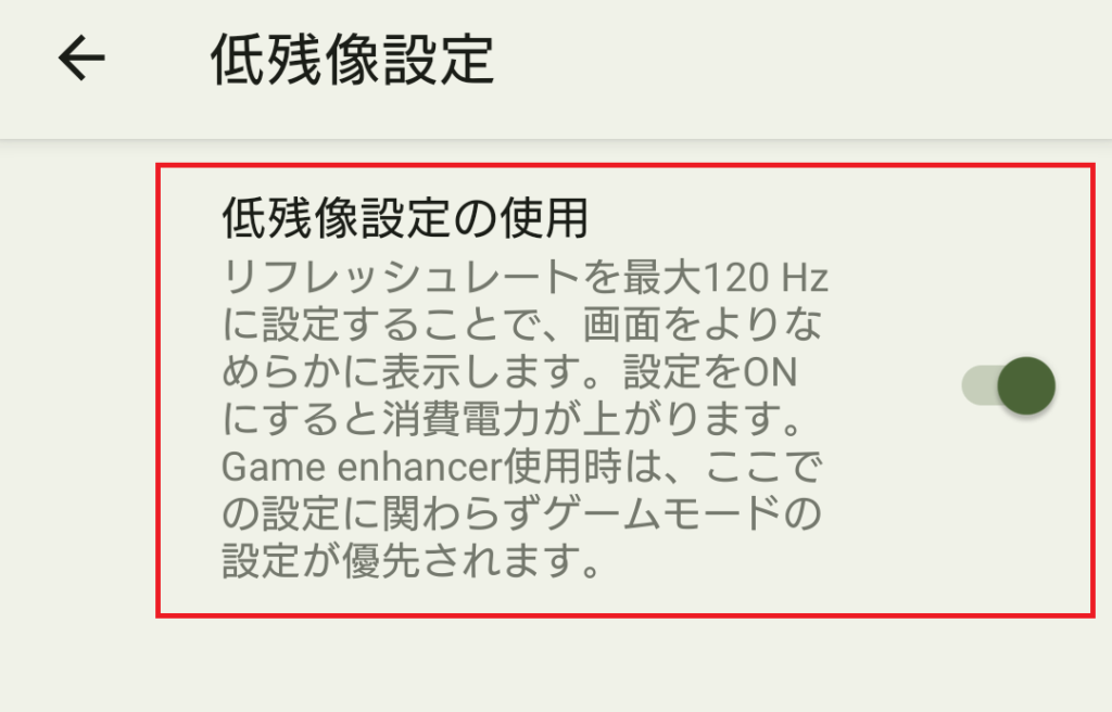 で、改めて設定を見返してみると、低残像設定を有効化することでかなり改善したのでメモ。ただ、注意書きにバッテリー消費量が増加とあるので、その点だけは注意かもしれません。