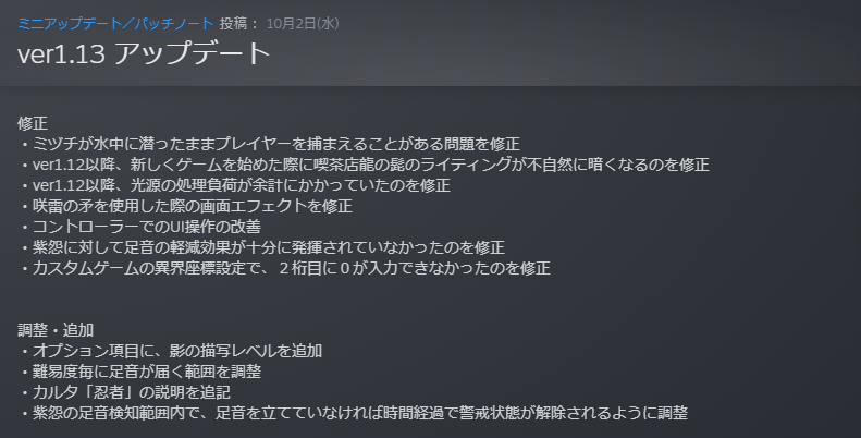 修正 ・ミヅチが水中に潜ったままプレイヤーを捕まえることがある問題を修正 ・ver1.12以降、新しくゲームを始めた際に喫茶店龍の髭のライティングが不自然に暗くなるのを修正 ・ver1.12以降、光源の処理負荷が余計にかかっていたのを修正 ...