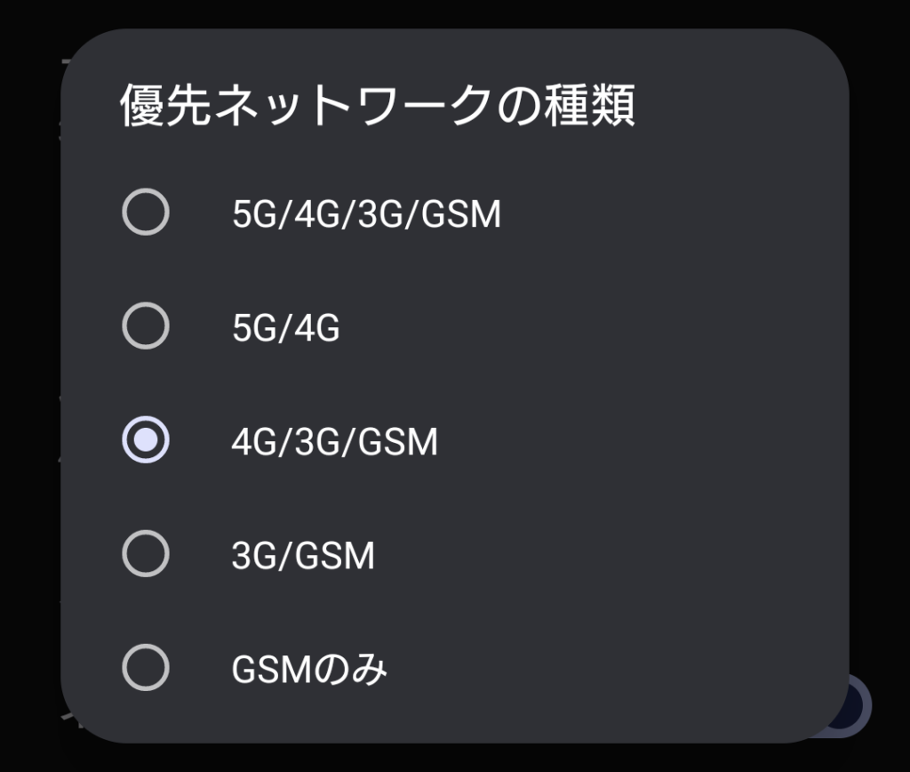 Android 通信で5Gを使わなくする方法のメモ 技術 2024.12.16 5Gが頻繁に切り替わる場合にやりたくなる設定。機種やアンドロイドバージョンによって異なる場合もあるので参考まで。確認したandroidバージョン:14 ◆設定画面でネットワークとインターネットを選択 ◆インターネットを選択 ◆優先ネットワークの種類を選択 ◆5Gを含まないものを選択 4G以外は事実上意味は無いので4Gを含むが、5Gを含まない選択肢が良いと思う。それにしても切り替わりが激しいとテザリングは使い物にならなくなるので困りますね。