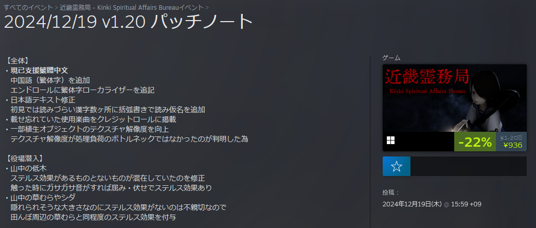 近畿霊務局 2024/12/19 v1.20 パッチノート 近畿霊務局 2024.12.20 ウツロマユも結構高頻度(ただ、あちらは言語対応がメイン)だけど、こちらも結構頻度の高いアップデートがされますね。おまけに12/20時点でセール中の模様。 ◆Steam 近畿霊務局 - Kinki Spiritual Affairs Bureau-2024/12/19 v1.20 パッチノート-Steamニュース【全体】 ・現已支援繁體中文 中国語(繁体字)を追加 エンドロールに繁体字ローカライザーを追記 ・日本語テキスト修正 初見では読みづらい漢字数ヶ所に括弧書きで読み仮名を追加 ・載せ忘れていた使用楽曲をクレジットロールに掲載 ・一部植生...