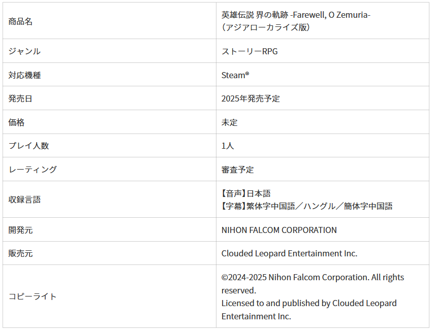 Steam®用ソフトウェア『英雄伝説 界の軌跡 -Farewell, O Zemuria-』アジアローカライズ版2025年発売決定! | 日本ファルコム 公式サイト