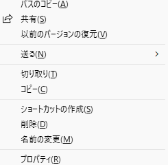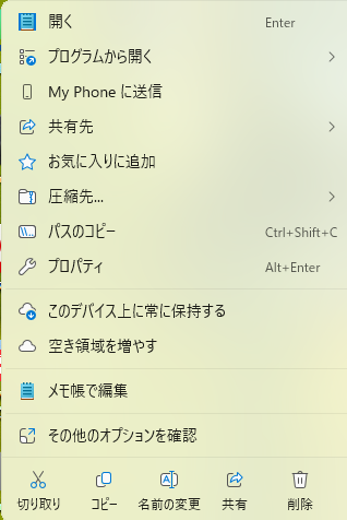 Windows11 右クリックで昔のメニューをすぐに出す方法 技術 2025.07.30 自分向けメモ。Shiftキーを押しながら、右クリック。 ↑右クリックするだけだと上記のようなメニューが出てくるが、Shiftキーを押しながら右クリックするとWindows10のような以下のメニューが表示される。 レジストリを操作しても出来るらしいが、常に操作できるとは限らないので、この方が良さそうだ。