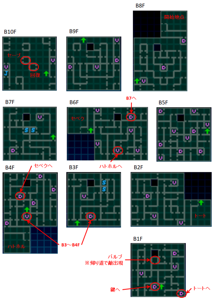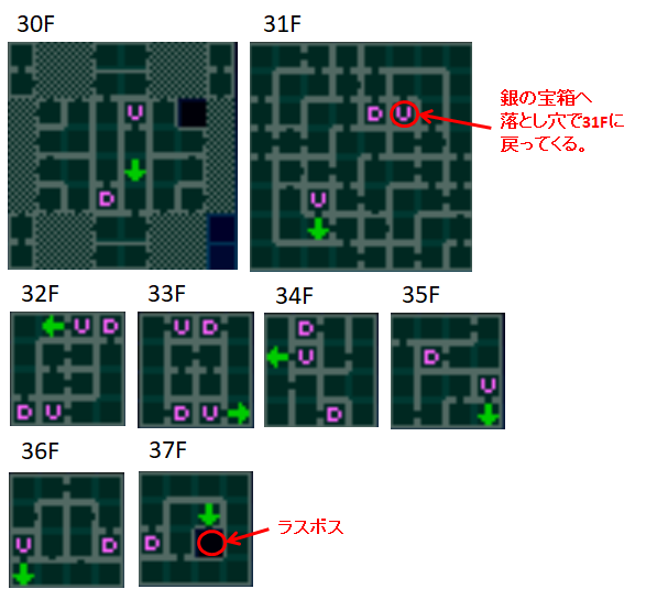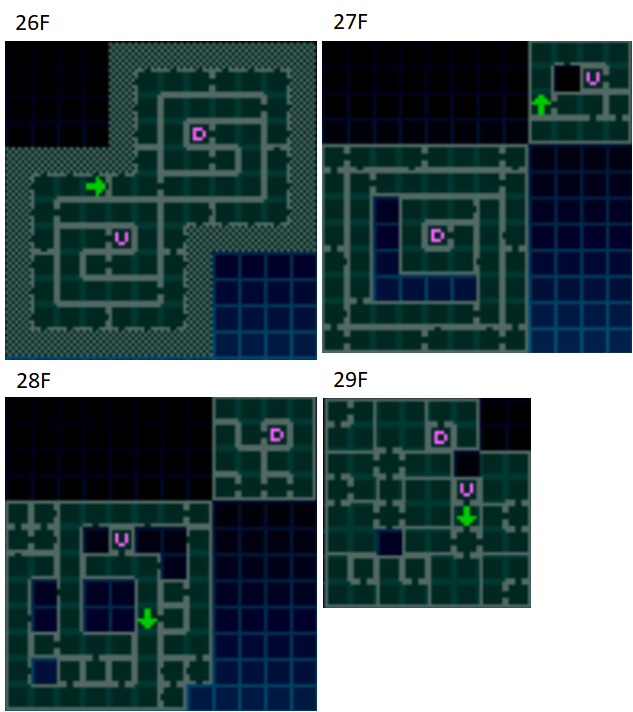 - 29Fは真・女神転生2のような一歩通行壁があるが、ただ進むだけ。