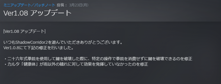 | 2026/03/23 | PC版v1.18.1アップデート Steam 画像版 ※Steam上は1.08となっていますが、ゲーム上は1.18.1です。 ◆修正 ・二十六年式拳銃を使用して鍵を破壊した際に、特定の操作で拳銃を消費せずに鍵を破壊できるのを修正 ・カルタ「健康体」が雨以外の穢れに対して効果を発揮していなかったのを修正 |