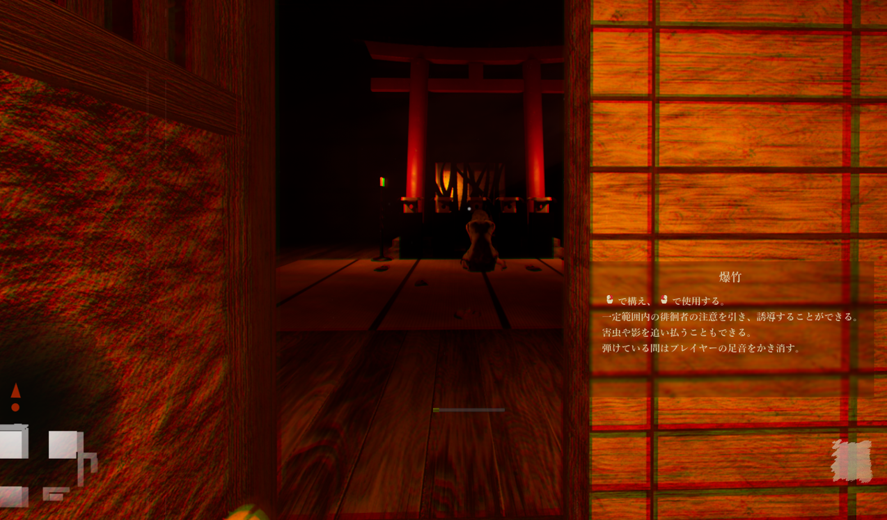 - 敵へのバレやすさは、走る>歩く>屈む。屈むでも音はゼロではないので、あまりに近い場合はバレてしまう。